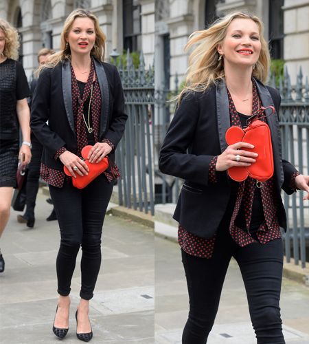 トップモデルのケイトは、シックなスーツスタイルにクラッチ感覚で使える真っ赤なキスロック・リストレットでお茶目に差し色。ブラウスのハート柄やリップの赤とマッチさせて女らしく。