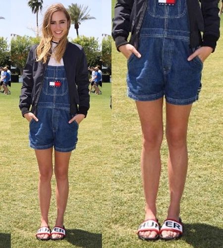 赤の縁とロゴでインパクト大のHunterのスライドサンダルは、Tommy Hilfigerのハーフ丈デニムオーバーオールの上からメンズHunterのボンバージャケットをオンしてボーイッシュに。