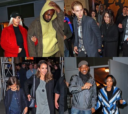 観劇に来たセレブたち。左上から時計回りに、カニエ・ウェスト&キム・カーダシアン夫妻、ヴァネッサ・ハジェンズ&オースティン・バトラー、ウィル&ジェイダ・ピンケット・スミス夫妻、ジェシカ・アルバ&娘。