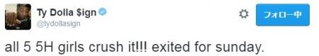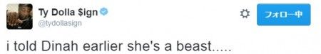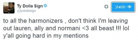 これに焦ったタイ・ダラー・サインは続けて、「フィフス・ハーモニーのガールズ5人全員が最高だったよ!」「前にダイナにも彼女は最高だって伝えた…」とツイート。