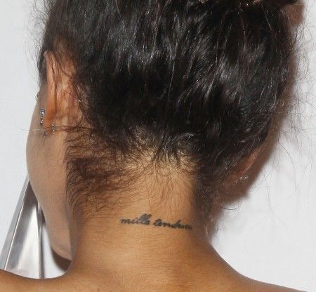 2014年3月にうなじに入れた「Mille Tendresse」には、フランス語で「はかり知れない優しさ」という意味が。アリアナのお気に入り映画『ティファニーで朝食を』のセリフでもある。