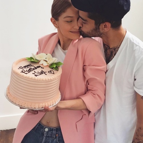 「ハッピーバースデー、ジジ」とデコレーションされたケーキを受け取ると、彼氏である元ワン・ダイレクションのゼイン・マリクからキスを受けていた。
