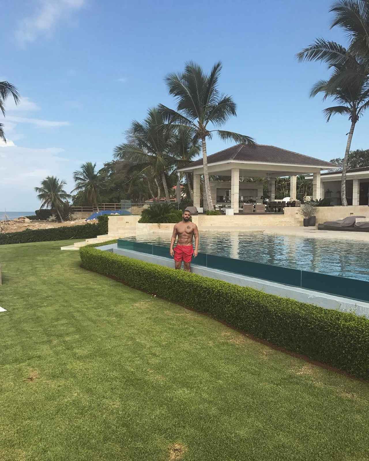 続けて投稿された写真には、「平和を求めている」というコメントとともに、ホテルのプールサイドで、引き締まったボディをあらわにしているドレイクの姿が写っている。