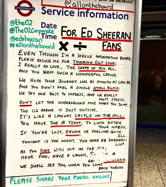 エド・シーランのロンドン公演会場の最寄り駅で駅係員からファンに向けて書かれたメッセージが多くのファンを喜ばせている。