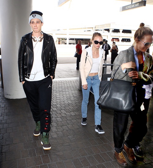 アッシュ(左)を同伴して、母と弟(右)と共に空港に到着したリリー・ローズ(中央)。