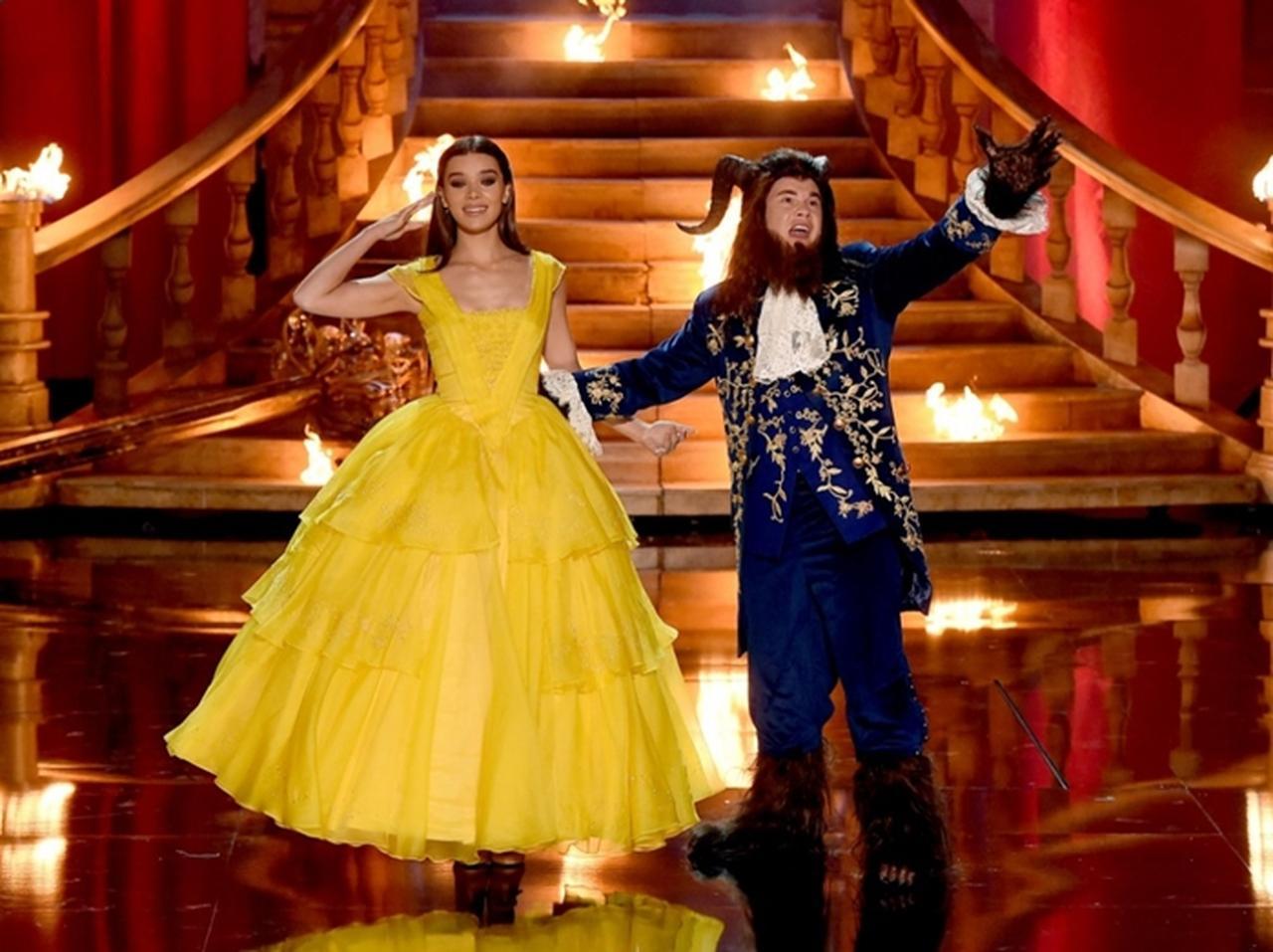 同アワードで今回ホストを務めた俳優のアダム・ディヴァインが、パロディで野獣役を演じ、歌や踊りを披露しながら「ベルが必要なんだ」と叫ぶと、客席からヘイリーがパープルのコートを脱ぎ捨てながら、「私はここよ」と応答し観客を沸かせた。