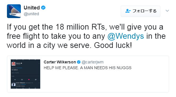 実はユナイテッド航空は事件を起こす前、カーターに対して、「もし1,800万リツイートを達成したら、世界中どこのウェンディーズにでも無料で行ける航空券をプレゼントするよ。頑張ってね」とツイートしており、あくまでこの約束を守っているだけのよう。