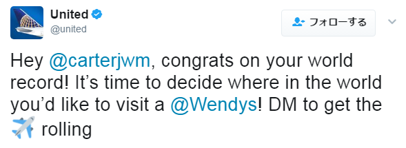 そんなカーターの記録達成に、ユナイテッド航空が反応。「どうも、カーター。世界記録おめでとう! 今こそ、どのウェンディーズに行きたいか決める時だよ。ダイレクトメールを送って、航空券をゲットして」と、少年に宛ててツイート。カーターがウェンディーズに行く際、ユナイテッド航空が無料で送迎を行うと提案した。