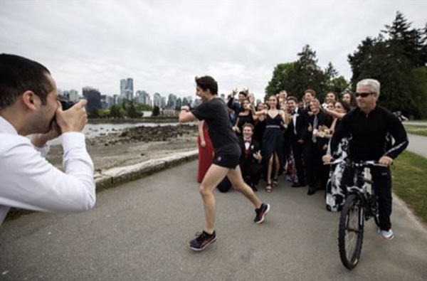 現地時間の先週金曜日(5月19日)、カナダの高校生たちが、卒業をお祝いするダンスパーティ「プロム」の前に防波堤で写真撮影をしたり会話をしたりしていたところ、なんとランニング中のジャスティン・トルドー首相が登場。