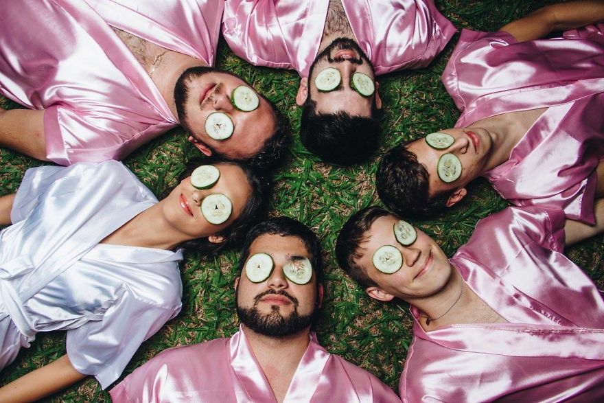 式の1週間前に、このアイディアに行きついたレベッカは、ウェディングフォトにありがちな花嫁とブライズメイドが和気あいあいと式の準備をする風景を男性ばかりのブライズメイドたちと一緒に再現。