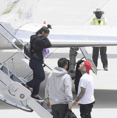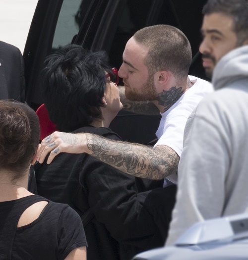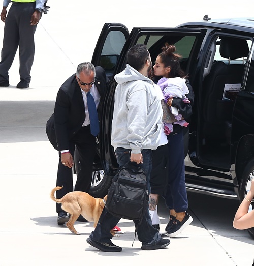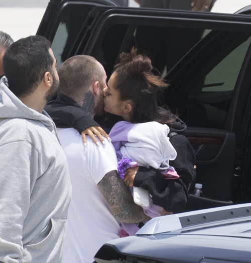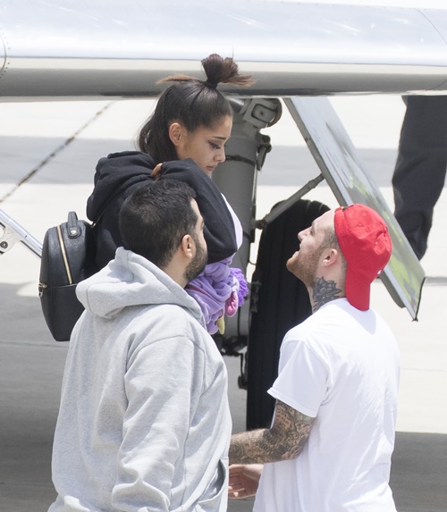 EXCLUSIVE: **PREMIUM EXCLUSIVE RATES APPLY**Devastated Ariana Grande was greeted with an emotional embrace from her boyfriend Mac Miller as she arrived home in Boca Raton, Florida, on Tuesday (may 23). The distraught pop superstar looked tired and downcast as she climbed off a private jet with mother Joan and other members of her entourage. Her tattooed beau waited at the bottom of the aircraft's steps with open arms, and the two shared a tender kiss amid Ariana's obvious emotional turmoil. Her return to US soil came less than 24 hours after ISIS bombed her concert at Manchester Arena as crowds of young fans were leaving, killing 22 and injuring 119 others. Miller was also seen hugging Ariana's mother before the group climbed into waiting limousines and being whisked away to her upscale gated community in Boca Raton. It's thought Grande had loaned the private jet from showbiz pal Taylor Swift, to make a hasty getaway after her show - part of the UK leg of her 'Dangerous Woman' worldwide tour - turned into a nightmare.