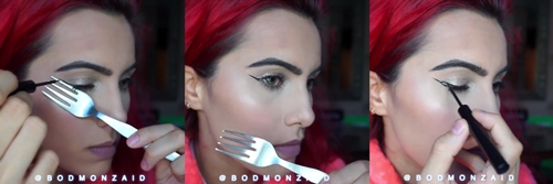 フォークを使ったメイク方法を紹介したのは、カナダのビューティーブロガーのレイバ・ゼイド。レイバは眉毛、アイライナー、そしてノーズシャドウにフォークを使用している。