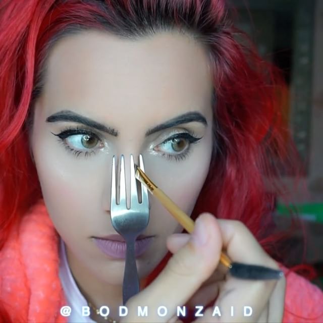 フォークを使ったメイク方法を紹介したのは、カナダのビューティーブロガーのレイバ・ゼイド。レイバは眉毛、アイライナー、そしてノーズシャドウにフォークを使用している。