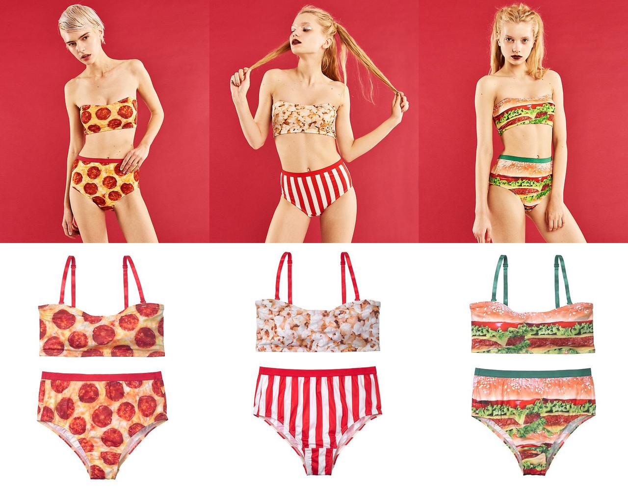 ジャンクフードをモチーフにしたアメリカンなデザインのランジェリーは、チューブトップはストラップレスとしても使用でき、ボトムはハイウエストでトレンド感がたっぷり。水着のようなデザインなので、夏のイベントなどでコーディネートのポイントとして、あえて見せて着るのもオススメ。