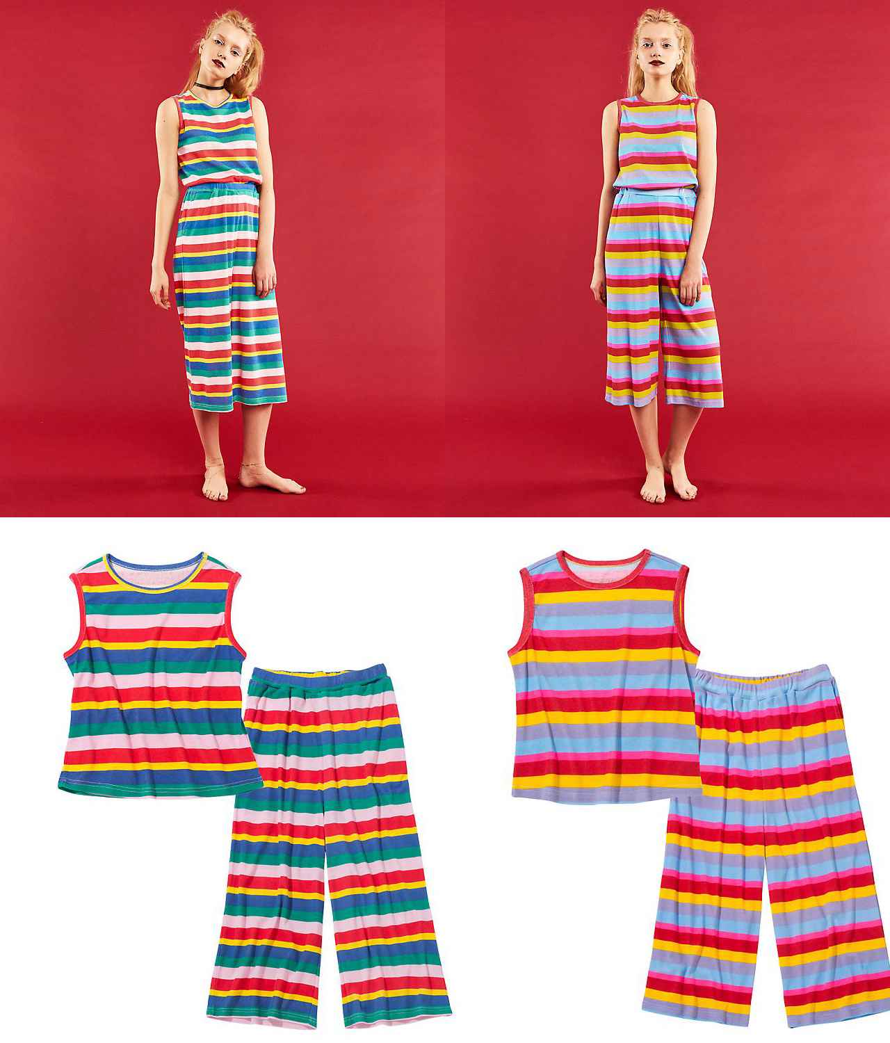 ジャンク柄ランジェリーの他にも、マルチカラーのボーダーセットアップは、フェスなどにもマッチするデザイン。クロップト丈のトップと半端丈のボトムで、スラッと脚長効果も。コットン混のリブ素材なので着心地も◎。