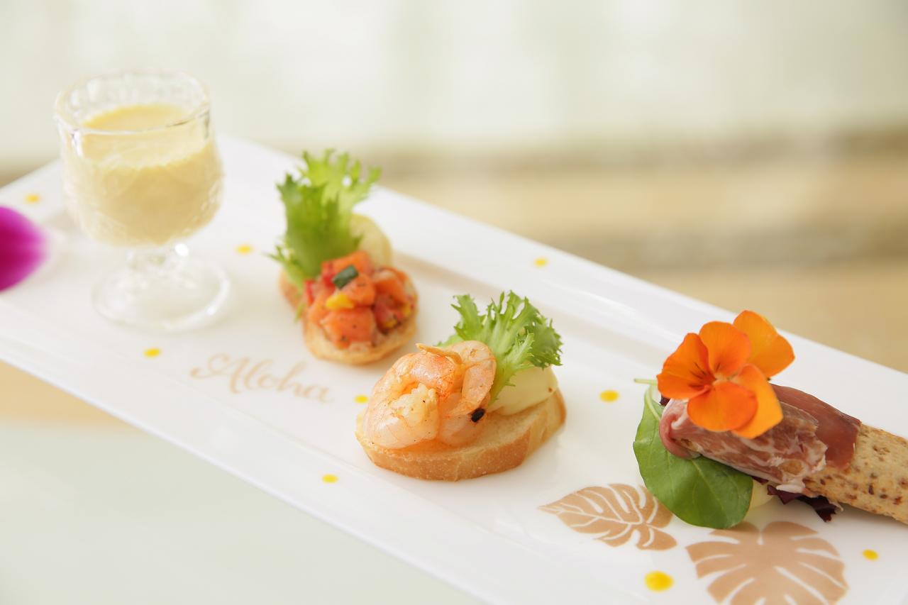 マンゴーヨーグルト/ガーリックシュリンプのオープンサンド/ロミロミサーモンのオープンサンド/ココナッツサブレの生ハム巻き