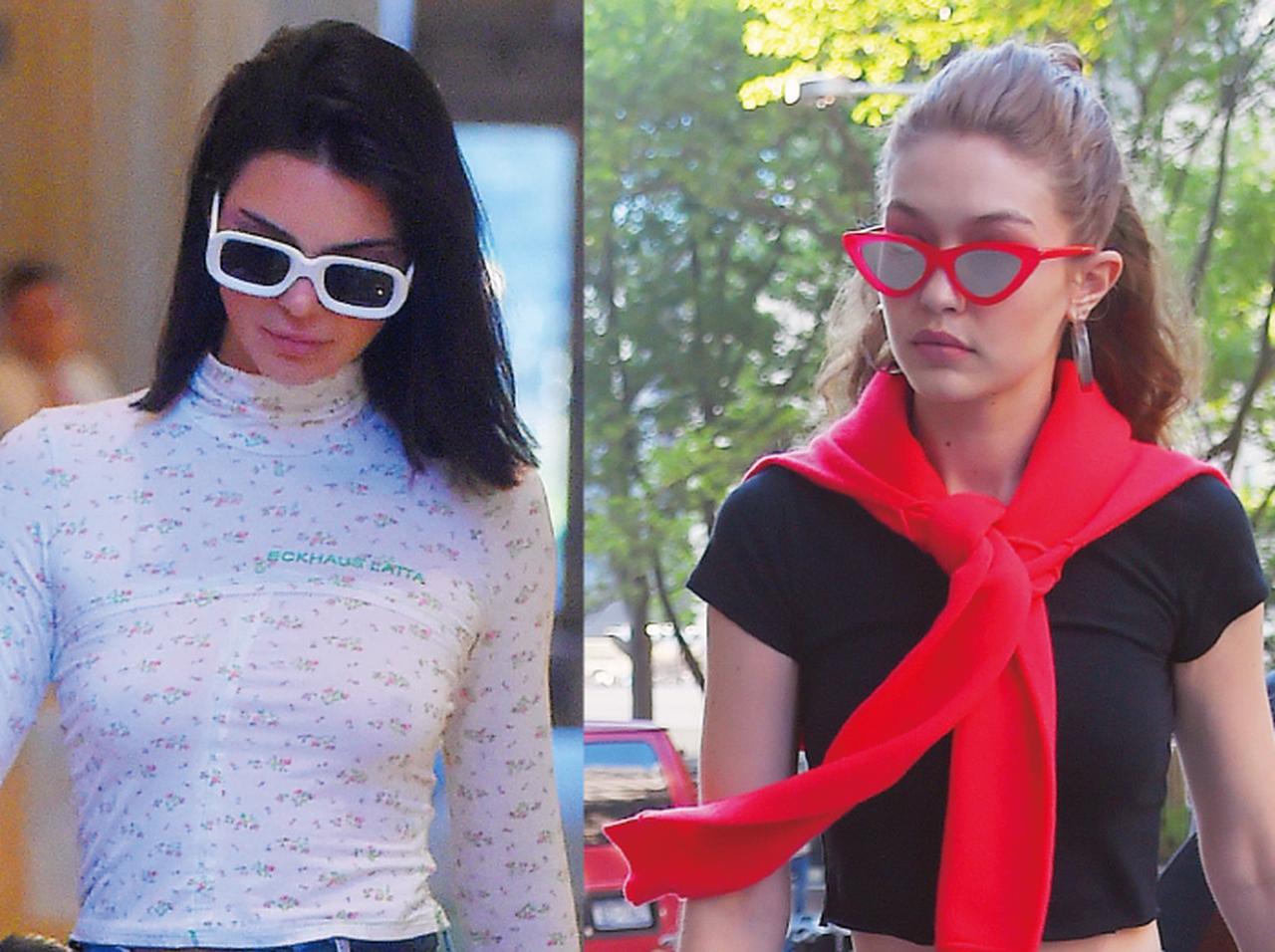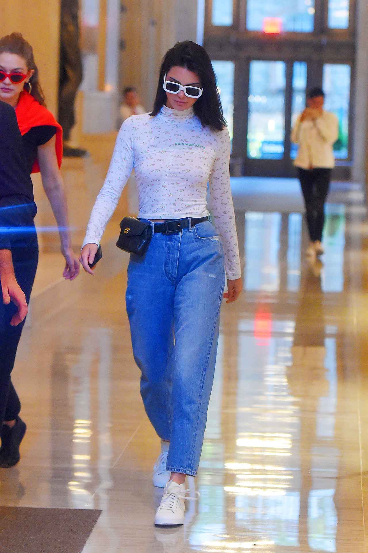ケンダルは、Chanelのヴィンテージ・ウエストバッグをアクセントにしたカジュアルなコーディネート。サングラス、トップス、スニーカーは全てホワイトで統一して。