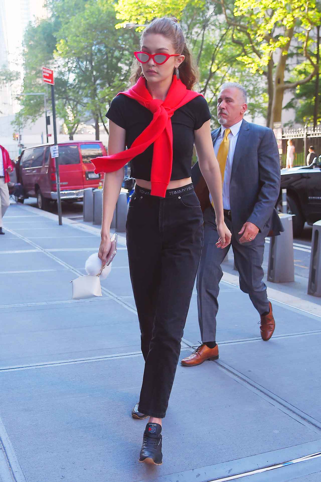 ジジは、トレンドのハイウエストデニムに、スウエット&サングラスをレッドでカラースタイリング。