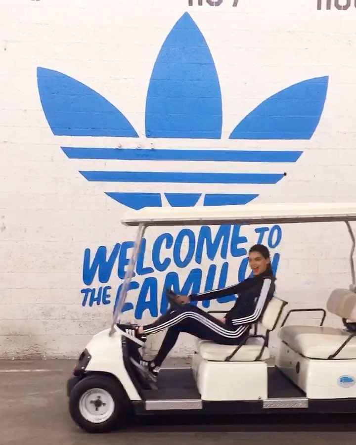 ケンダル・ジェンナーは、アディダス(adidas)のアイコニックなスリーストライプのセットアップを着てカートを運転する動画をインスタグラムにアップ。「公式にアディダス・ファミリーの一員になったわ」とコメントした。
