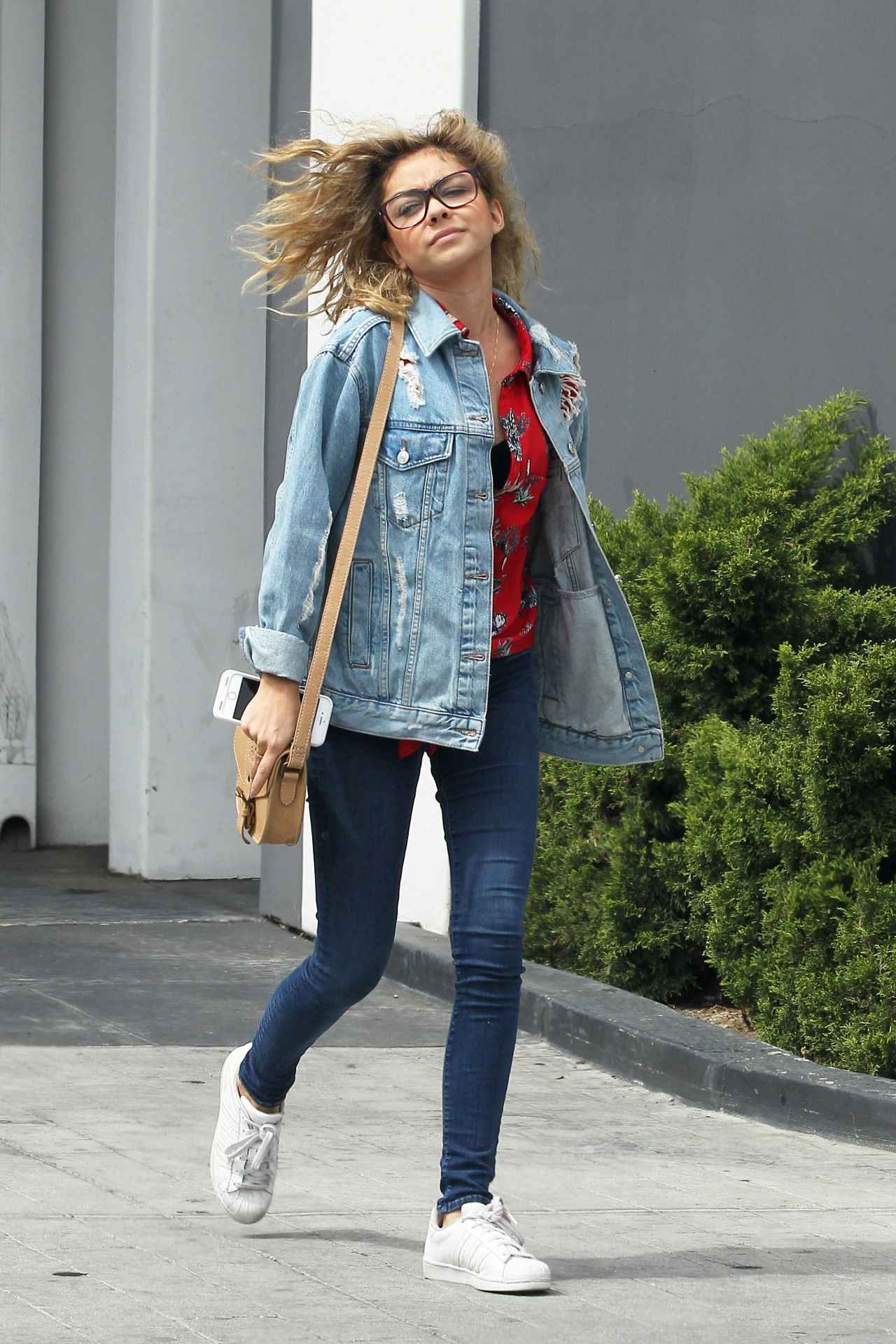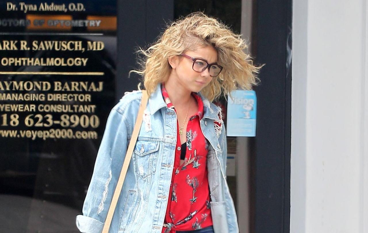 ドラマ『モダン・ファミリー』の人気女優サラ・ハイランドの休日をキャッチ。デニムONデニムに、赤いシャツをのぞかせたリラックス・コーデ。