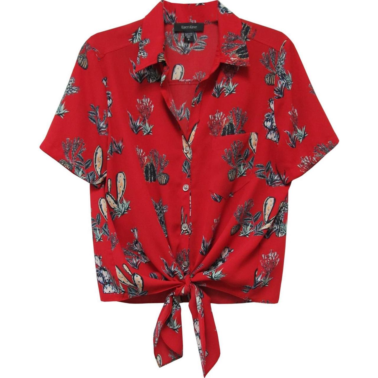 フロント部分を結んだデザインがこなれて見える赤いシャツは、夏らしいプリントがキュート。