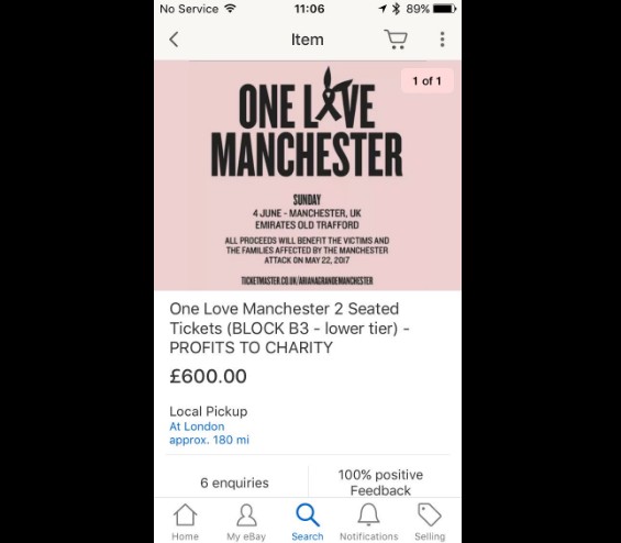 この事態に英eBayも自身のツイッターで反応しており、「私たちのサイトでワン・ラヴ・マンチェスターのチケットを売らないでください。私たちは掲載されているリストを削除し、制限します」「これはeBayルールに反することです。私たちはただちにこのような不当に利益を得ようとしている掲載を削除します」とコメントを出している。