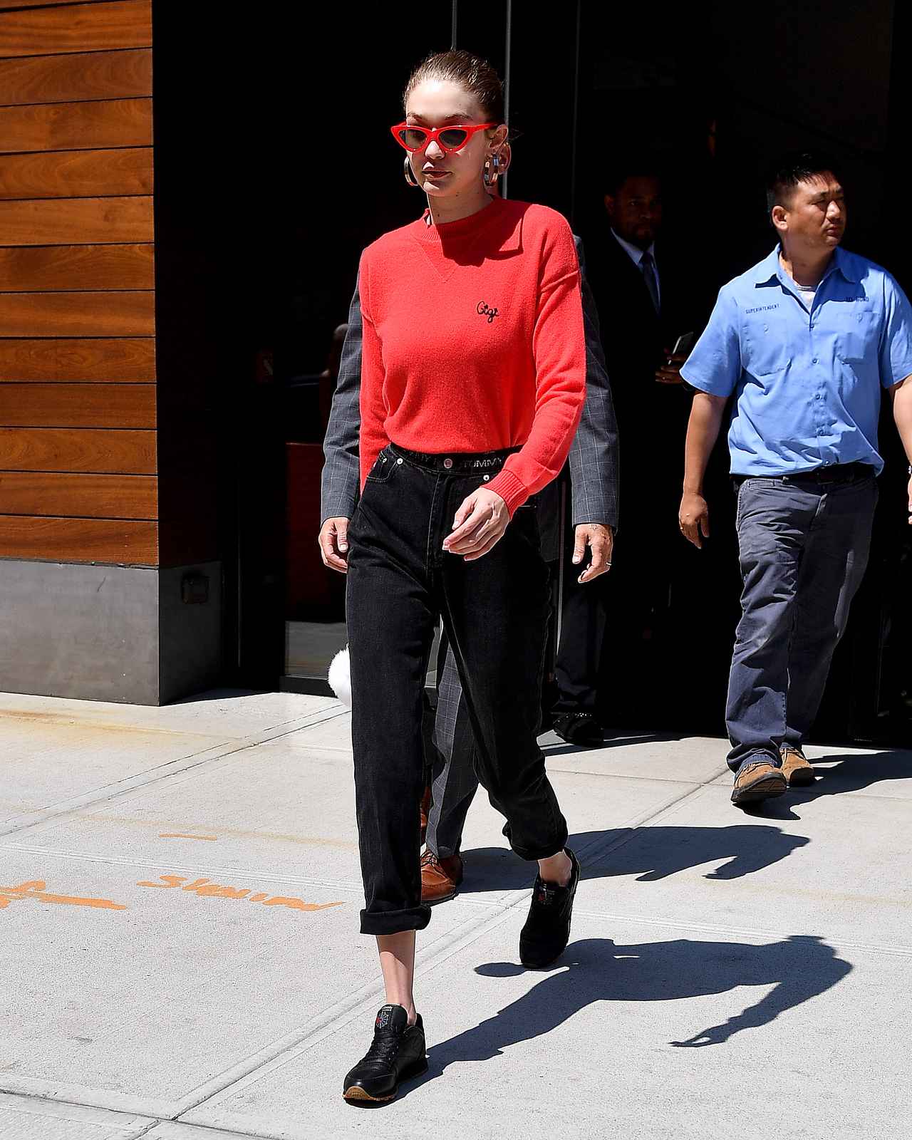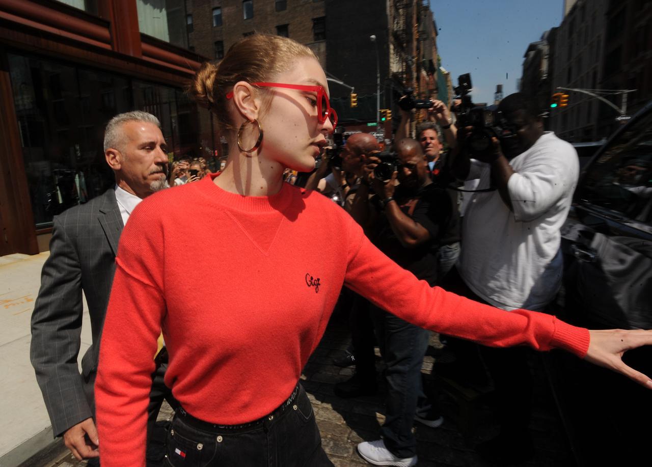 ニューヨークの自宅から出たところをキャッチされた人気モデルのジジ・ハディッド。コラボコレクションを展開するトミーヒルフィガーを着用し、リーボックのスニーカーを履いて登場したジジは、颯爽と車に乗り込みその場を後にした。