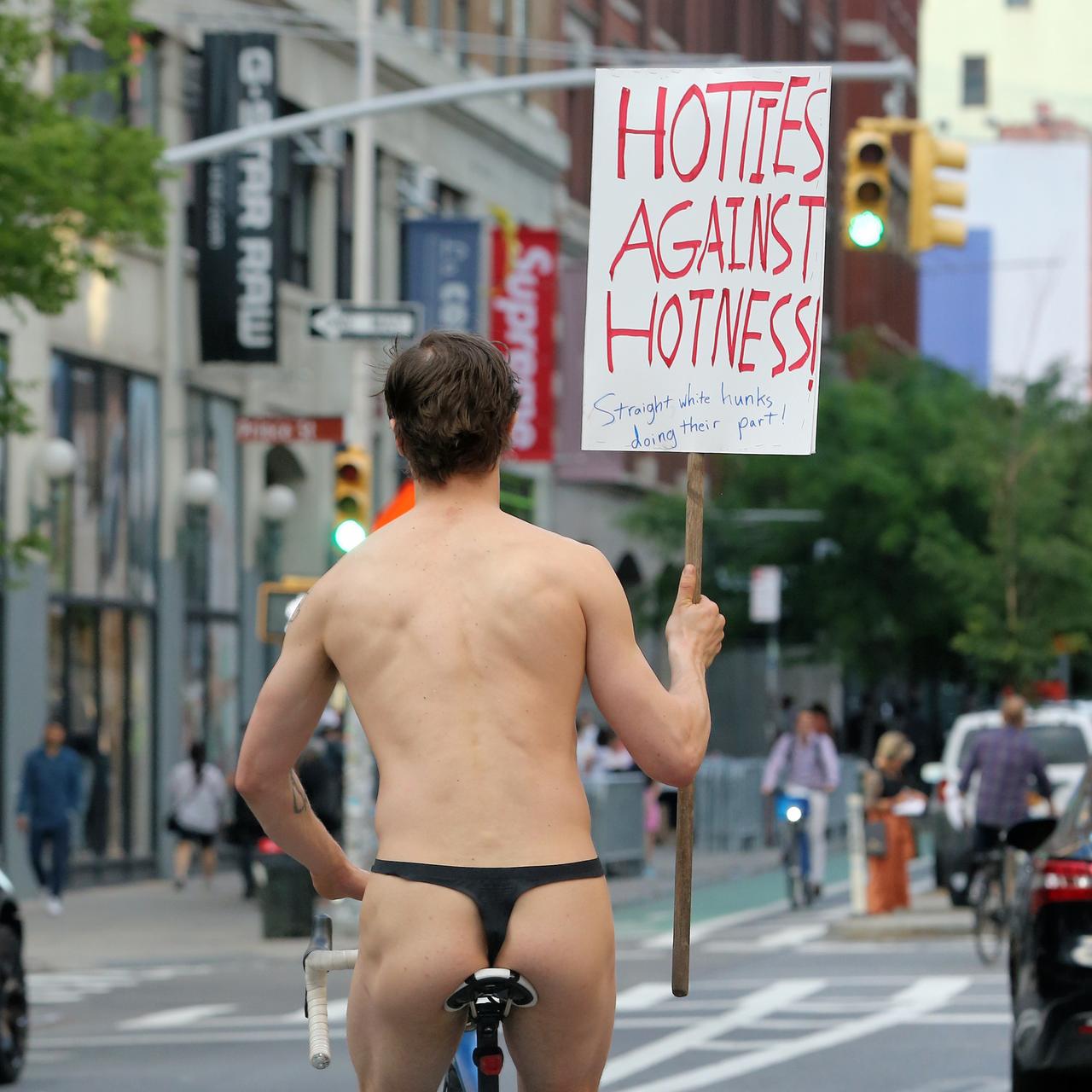 NYで裸の男性が独自のプロテスト