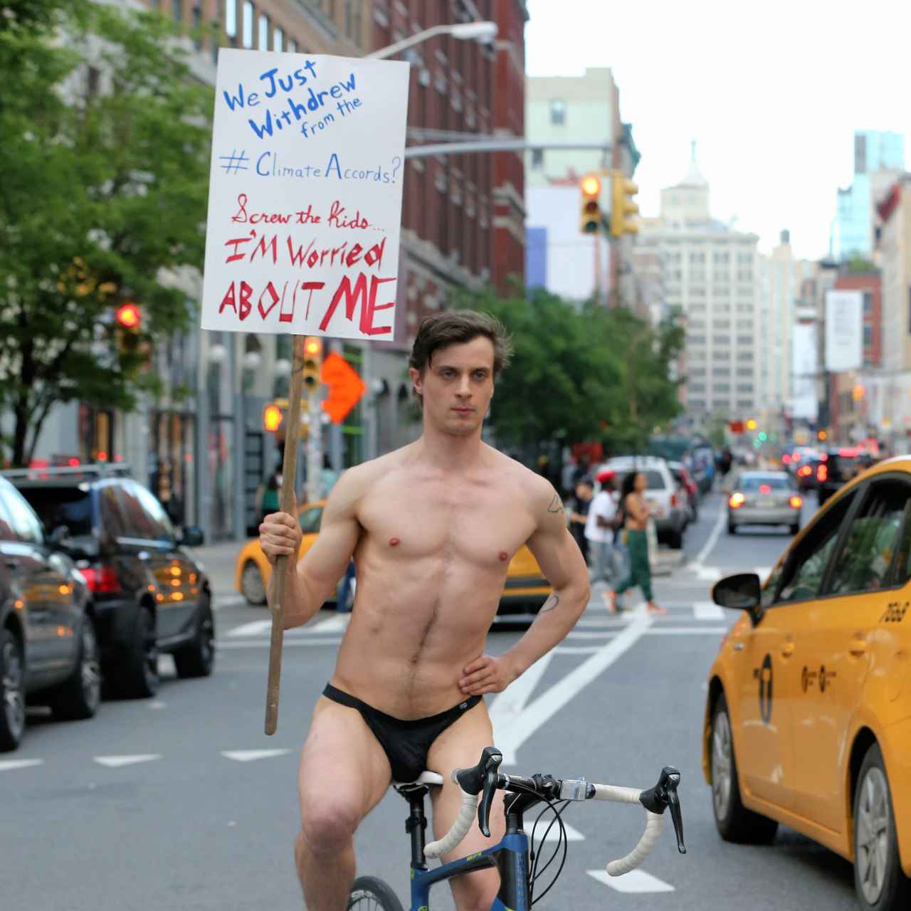 トランプ米大統領がパリ協定への離脱を表明したことを受けて、裸の男性がニューヨークで抗議活動を行った。