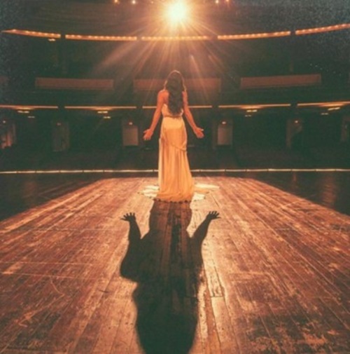 リア・ミシェル、劇場のステージに立ちスポットライトに照らされて。©Lea Michele
