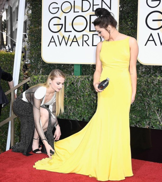 2016年のゴールデン・グローブ賞のレッドカーペットにて、メイジーのドレスの裾をソフィーが直してあげるという、まさに姉妹らしい瞬間。