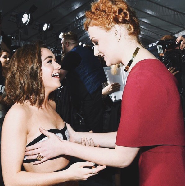 同ドラマのプレミアにて、ソフィーがメイジーの胸を触ってふざけている瞬間をパシャリ。