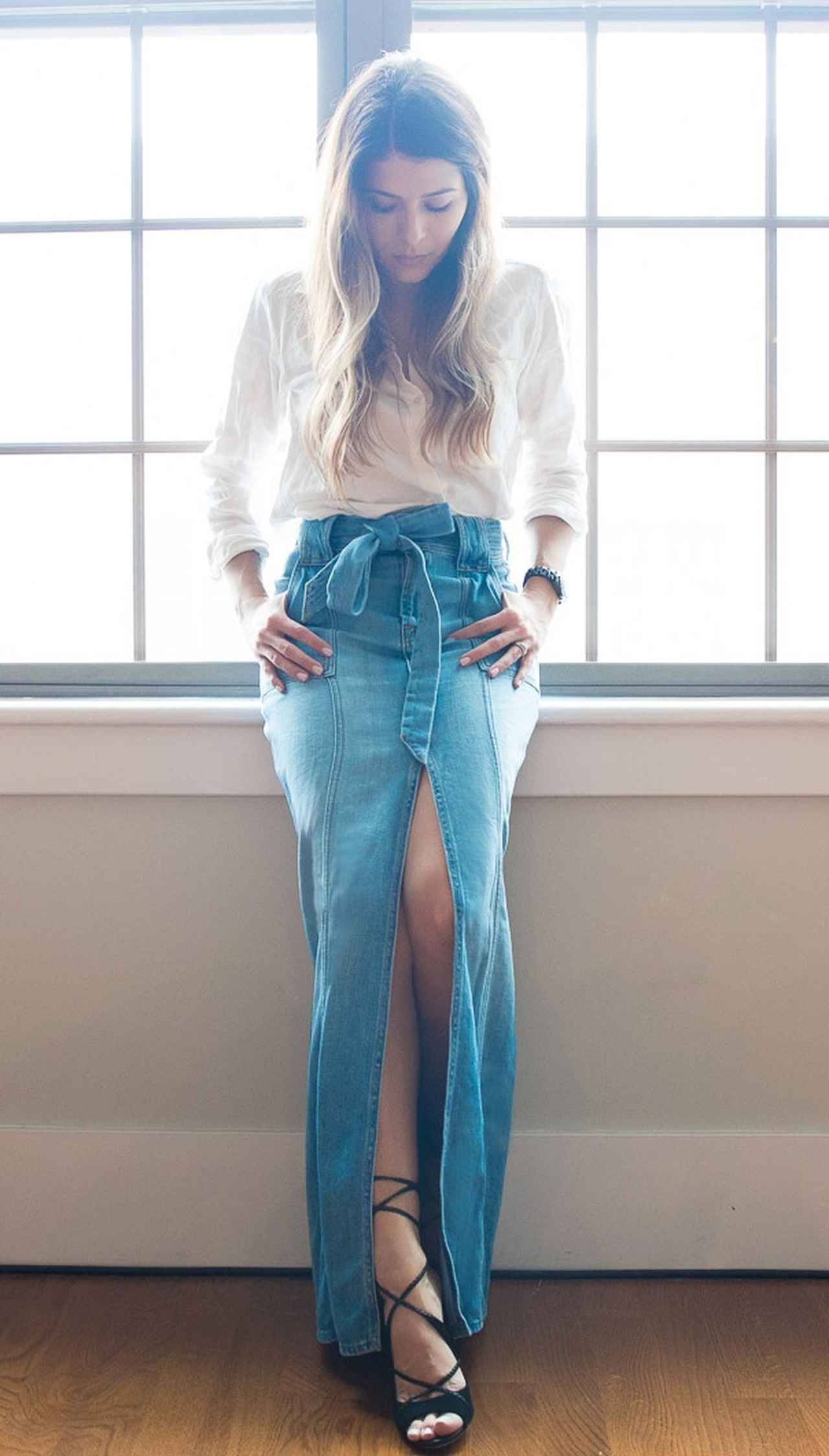 進化を続けるデニム界で各ブランドが続々と打ち出しているアイテムが、フロントにスリットが入ったデニムスカート。歩く度にちらりと脚が見えるデザインがセクシーかつ、エフォートレスに。