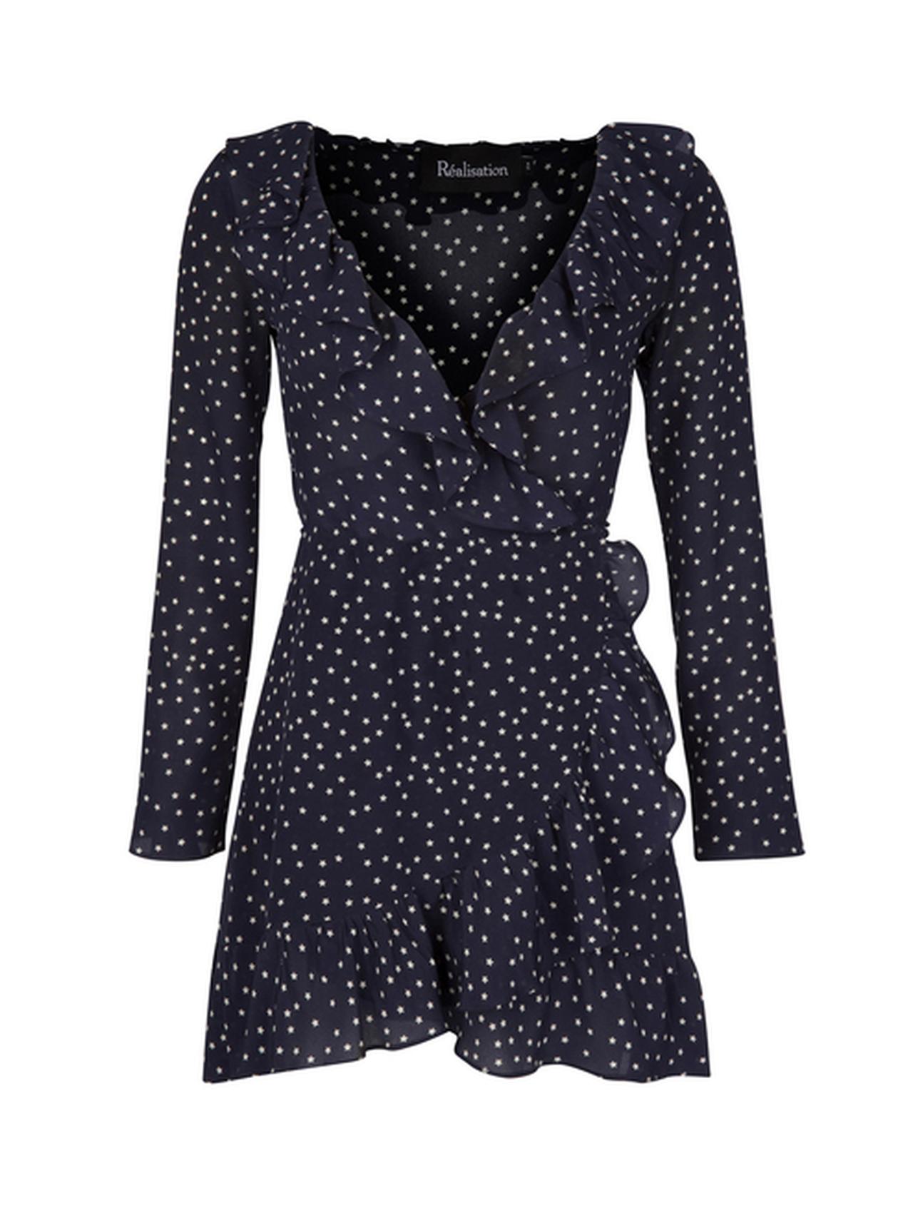 ドット柄に見えて、よく見ると小さな星柄になっているこのワンピースは、ガーリーなワンピースを多く取りそろえているブランドRealisationのもの。ラブリーなムードを漂わせつつ、PUMAの白スニーカーをセットして、甘さを引き算。