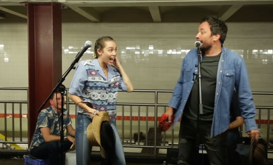 続けて、マイリーが「地下鉄でパフォーマンスするのは初めて! 超興奮してるわ!」と自身のヒット曲「パーティー・イン・ザ・USA」を披露すると、今度はみんなで大合唱に。平日朝の通勤風景とは思えないような盛り上がりを見せていた。
