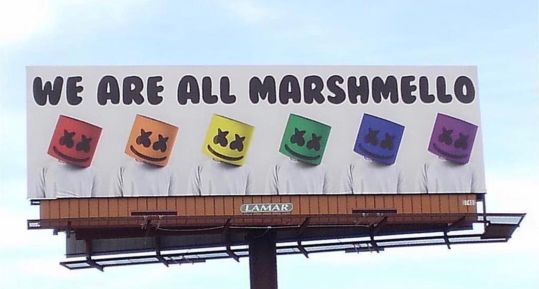 そんなマシュメロが、6月がプライド月間であることにちなみ、自身の覆面がレインボーに並んでいるビルボード広告の写真を公開。