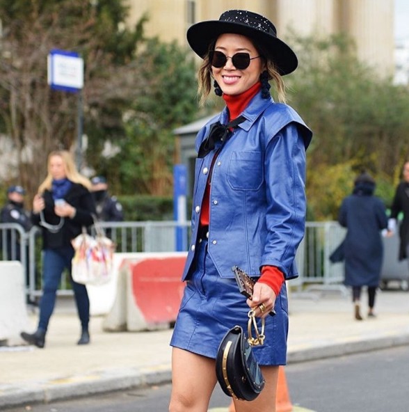 エイミーはファッションウィークにて、濃いネイビーのつば広ハットを、ブルーを全体に使用したスタイルに合わせて。