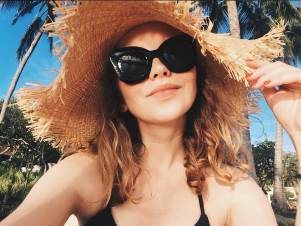 ファッションエディターのヴィクトリアは、大きいつばが特徴的なストローハットをビーチで着用。