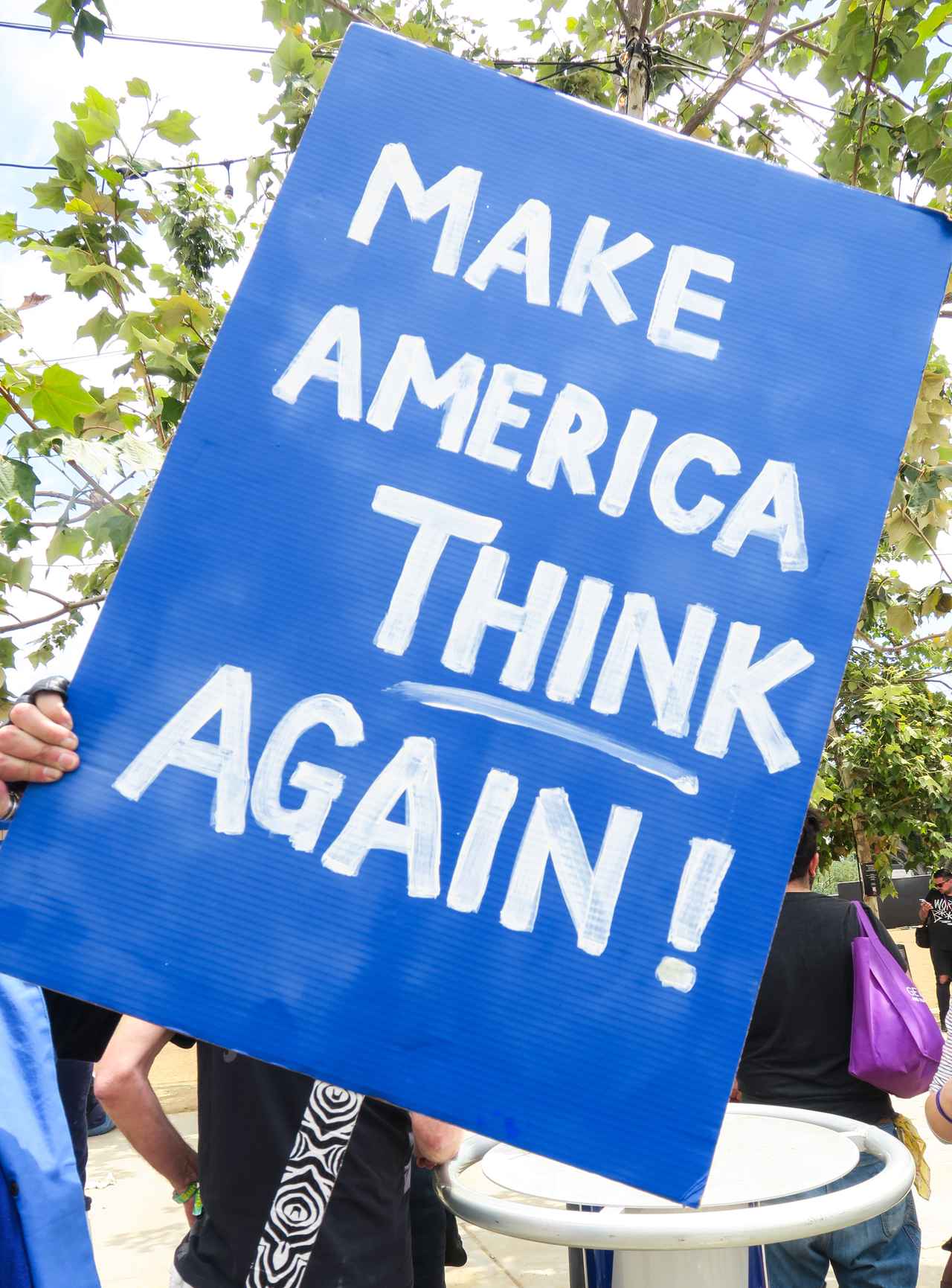 トランプ大統領の選挙中の「アメリカを再び偉大に」というスローガンを文字った「アメリカを再び考え直そう」というメッセージなどが多く見られた。