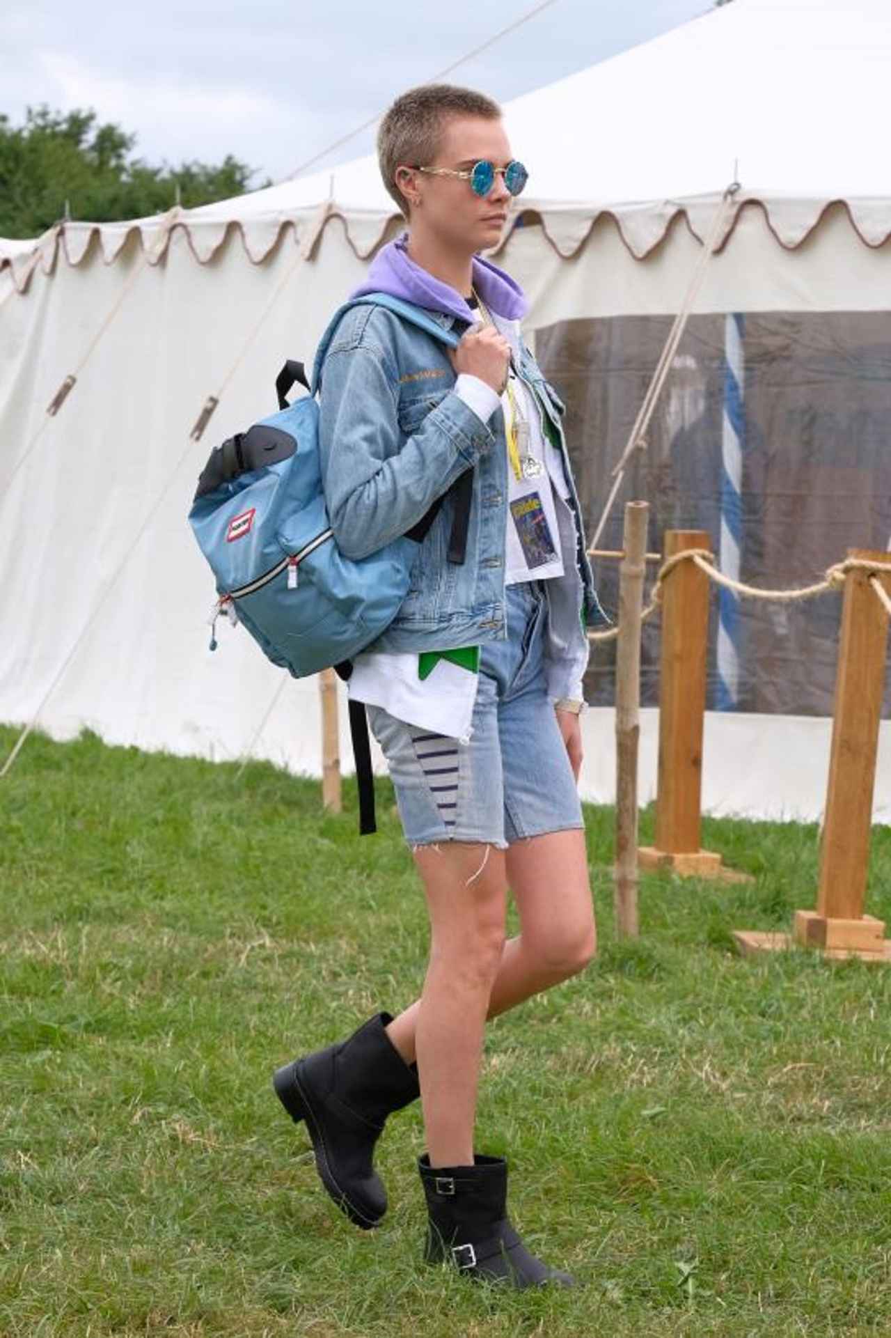 坊主ヘアが板についてきたカーラは、突然の気温の変化にも対応できるよう、デニムONデニムコーデのINにパーカーを重ねてレイヤードスタイルに。ナイロン素材のバックパックはHunter。ウォータープルーフのショートブーツでアクティブに。