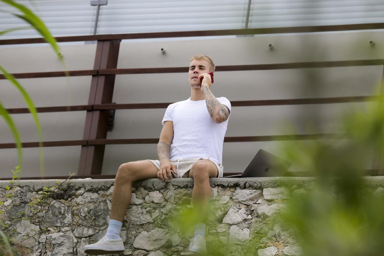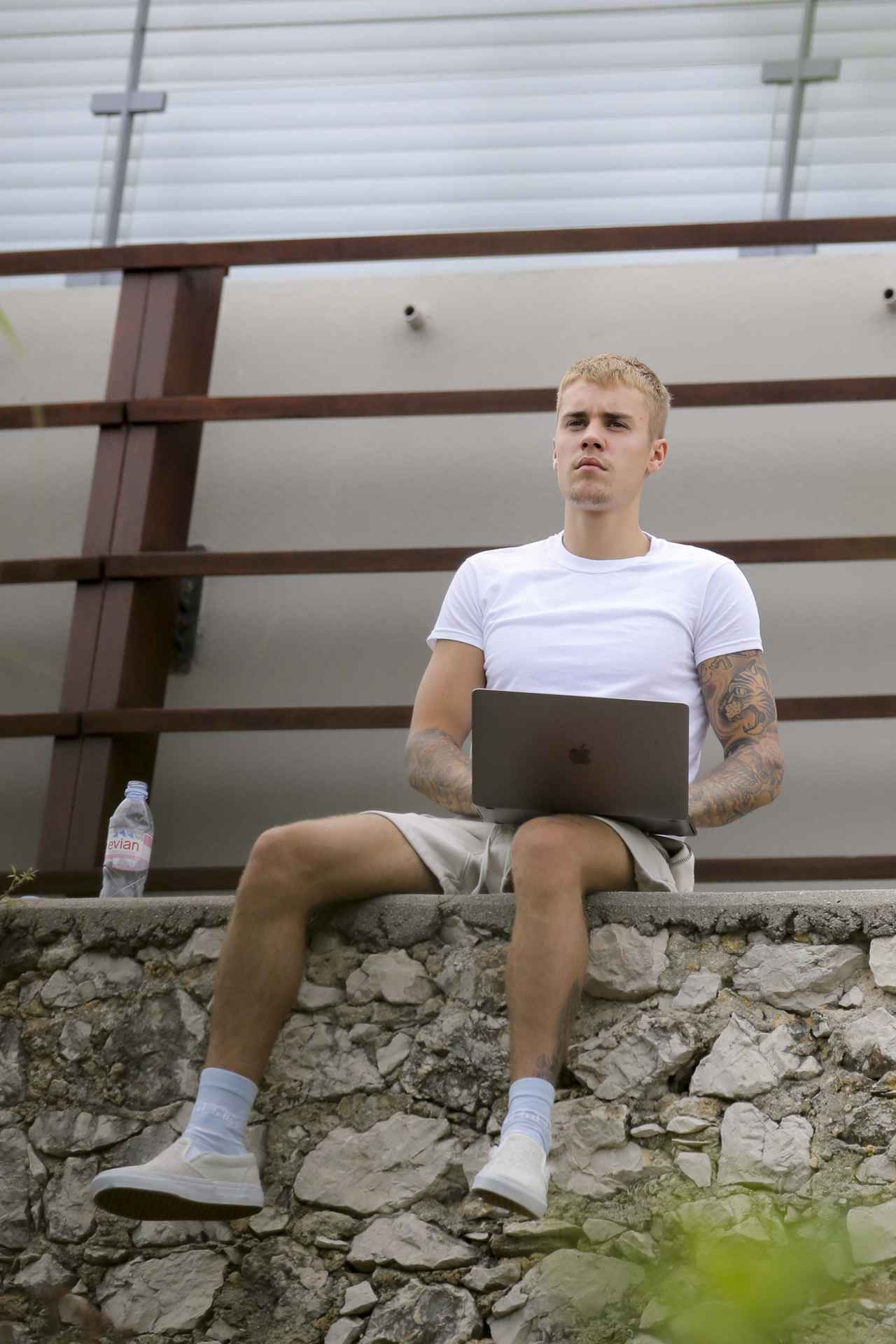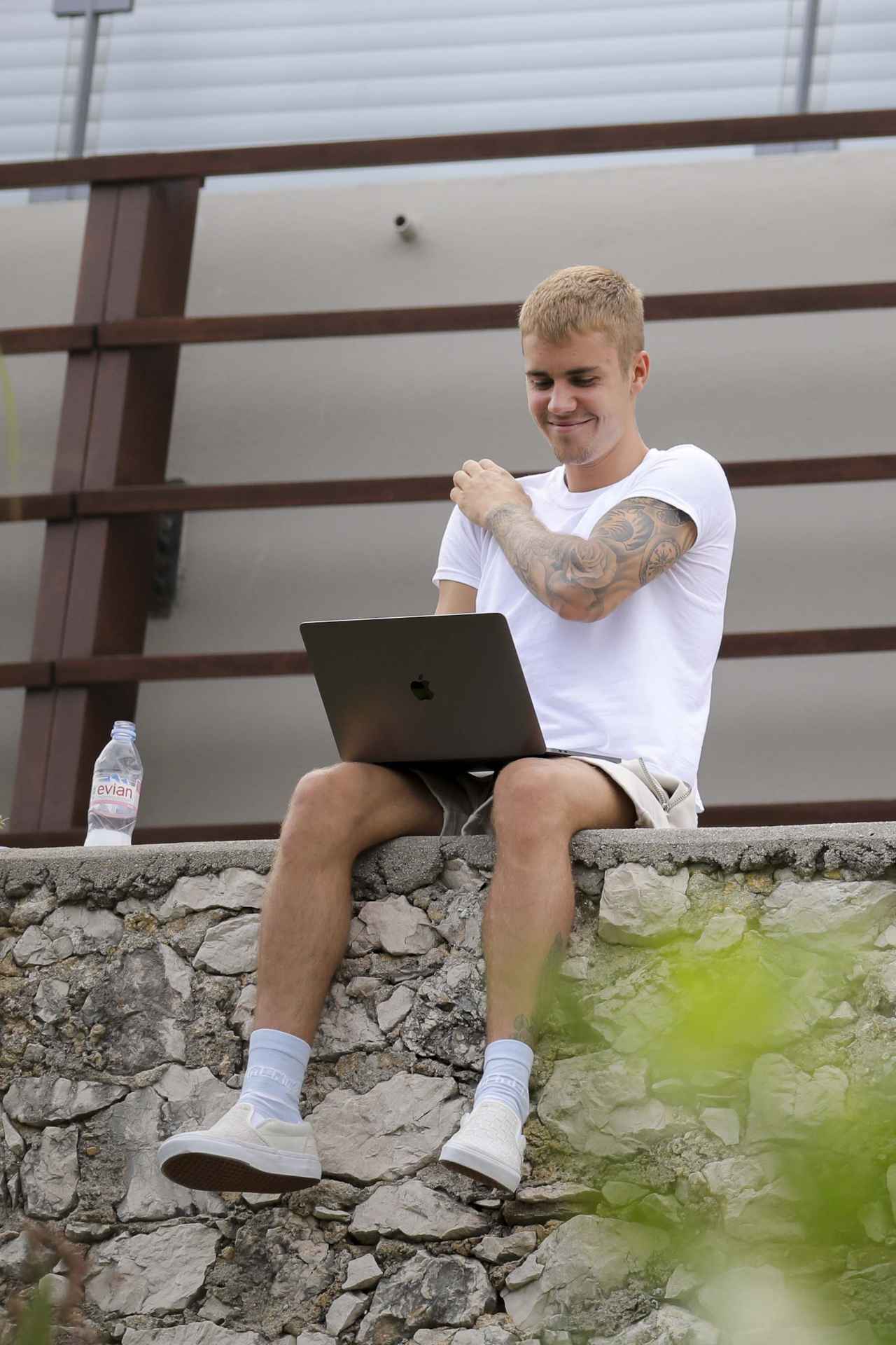 ジャスティン・ビーバーが、セレブが訪れるバケーション地でPCをいじりながら考えごと。