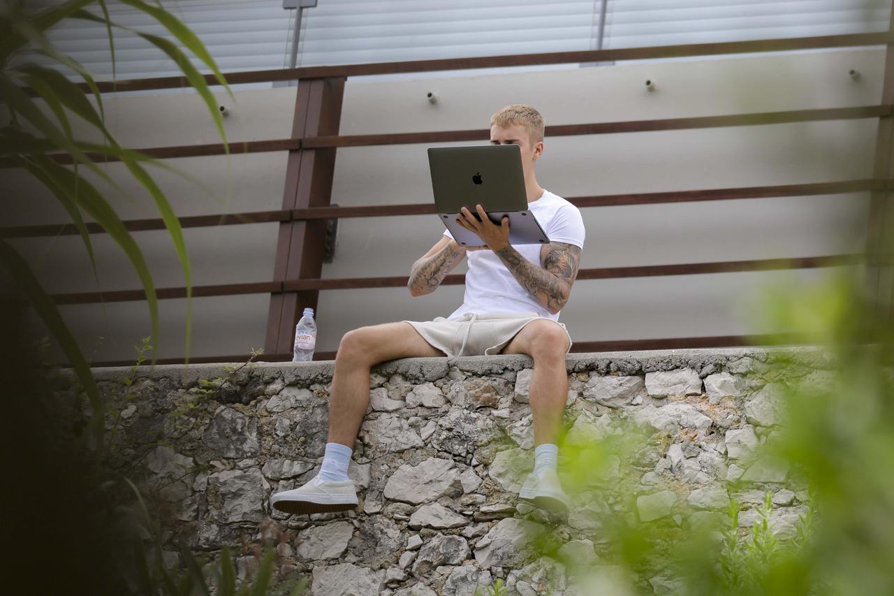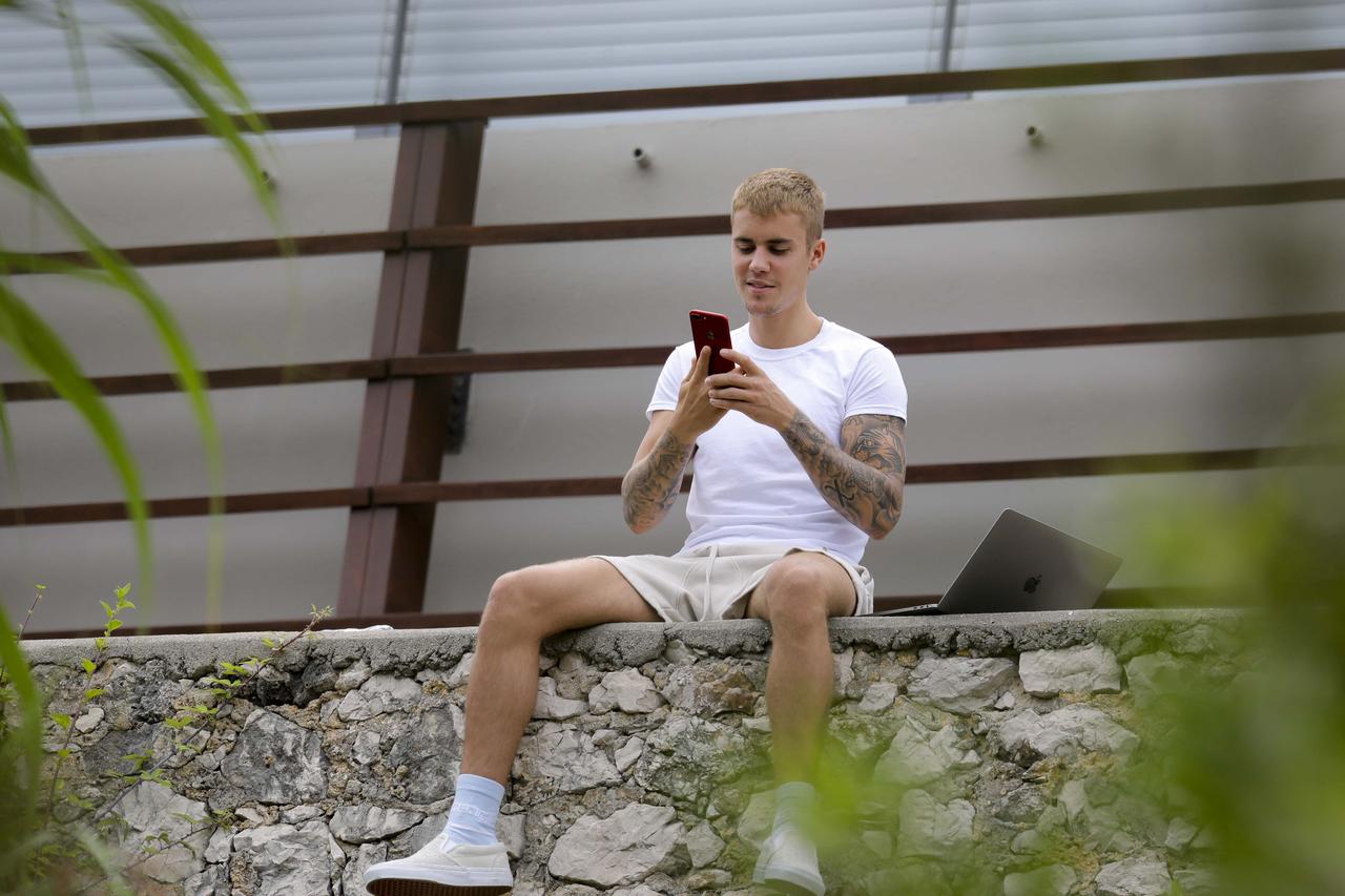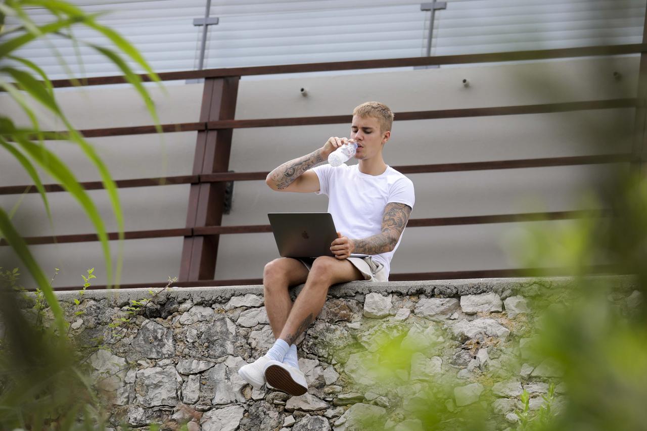 ジャスティン・ビーバーが、セレブが訪れるバケーション地でPCをいじりながら考えごと。