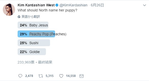 それを見かねた母親キムは、自身のツイッターで「ベイビー・ジーザス」「ピ-チー・ポップ(ピーチス)」「スシ」「ゴールディ」の4つから自身のファンに決めてもらうように依頼。