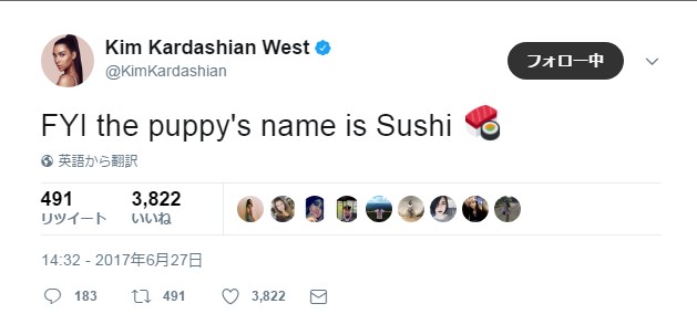 やはり子犬の名前は、一番人気のピーチー・ポップかと思っていたが、キムはツイッターで「参考までに子犬の名前はスシになりました」と報告。