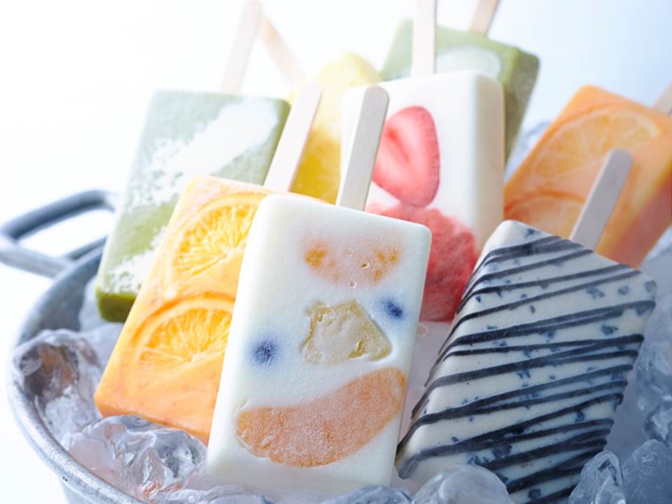 ミルクアイスに、黄桃、オレンジ、パイン、ブルーベリーをとじこめた贅沢なアイスバー。