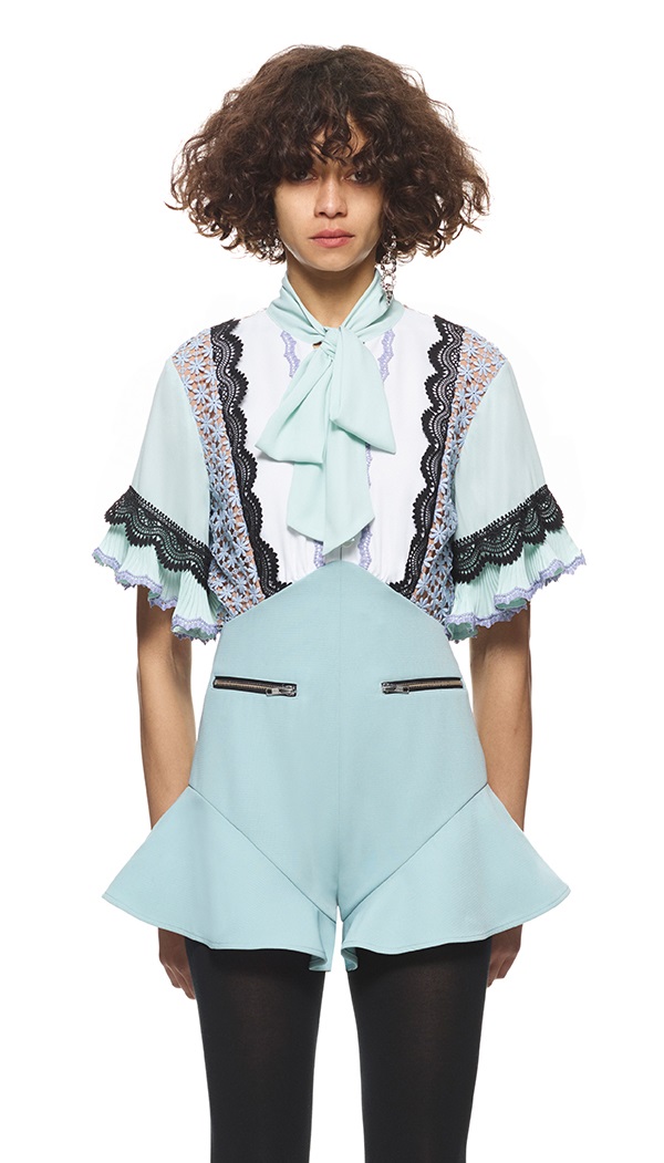 花柄などのレースがほどこされており、袖と裾がフレアになったロンパースはself-portraitのもの。フェミニンさを引き立てるボウタイ付きで乙女チックな雰囲気に。