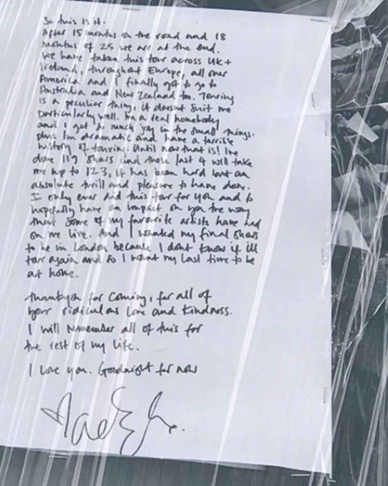 1人のファンが手にした、ロンドン公演のパンフレットの間にはさまっていたと言われるその手紙には、これまでツアーを応援してくれたファンへの感謝の言葉とともに、今後のツアー予定についての重大なメッセージが記されていた。