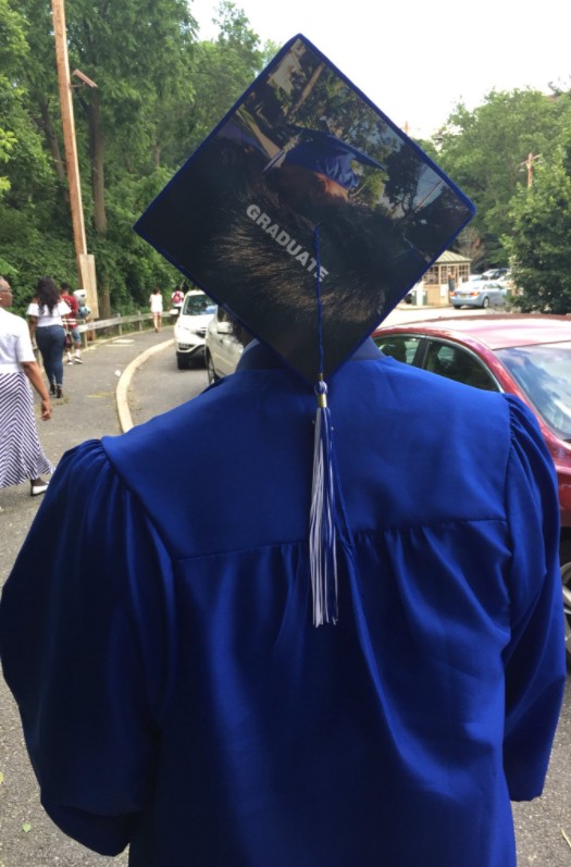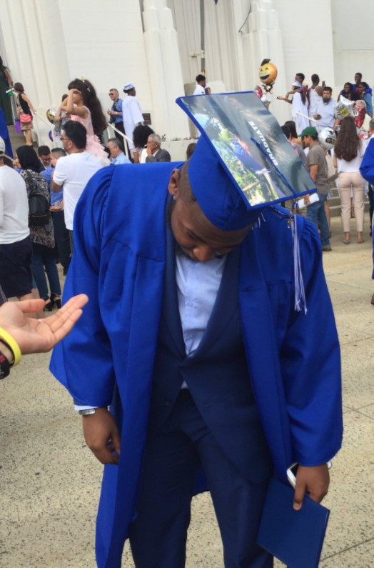 これで満足しないデインは、この写真をなんと帽子の上にプリントしたまま卒業式に参加。