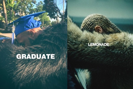 18歳のデイン・スコットは、まず、ビヨンセのアルバム『レモネード』のジャケットを真似して撮影。ファーコートを着て、下を向いたまま横顔を撮ってもらい、アルバムタイトルの「LEMONADE」をもじって「GRADUATE(卒業)」と文字を乗せたデイン。