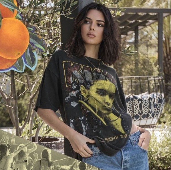 さらに、その上にケンダルとカイリーの顔やインスタグラムの写真、2人の名前の頭文字を取って「kk」という文字を重ねてプリントしており、自己流にアレンジしたヴィンテージTシャツとなっている。